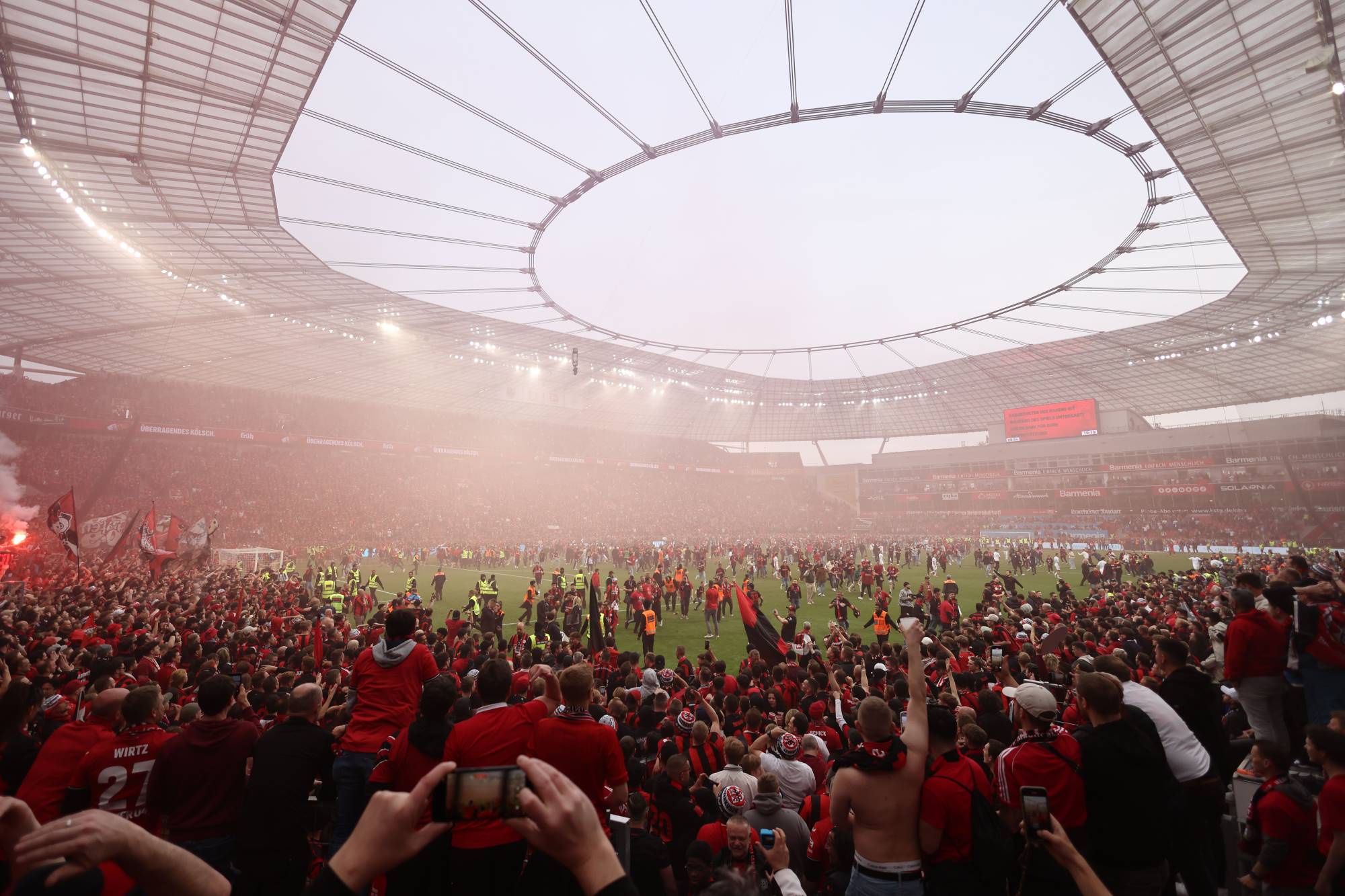 وقبل المباراة، شهدت جماهير ليفركوزن احتفالات كبيرة خارج الملعب، حيث أشعلت الألعاب النارية لاستقبال حافلة الفريق، وقامت بتحفيز اللاعبين على تحقيق هذا الإنجاز التاريخي.